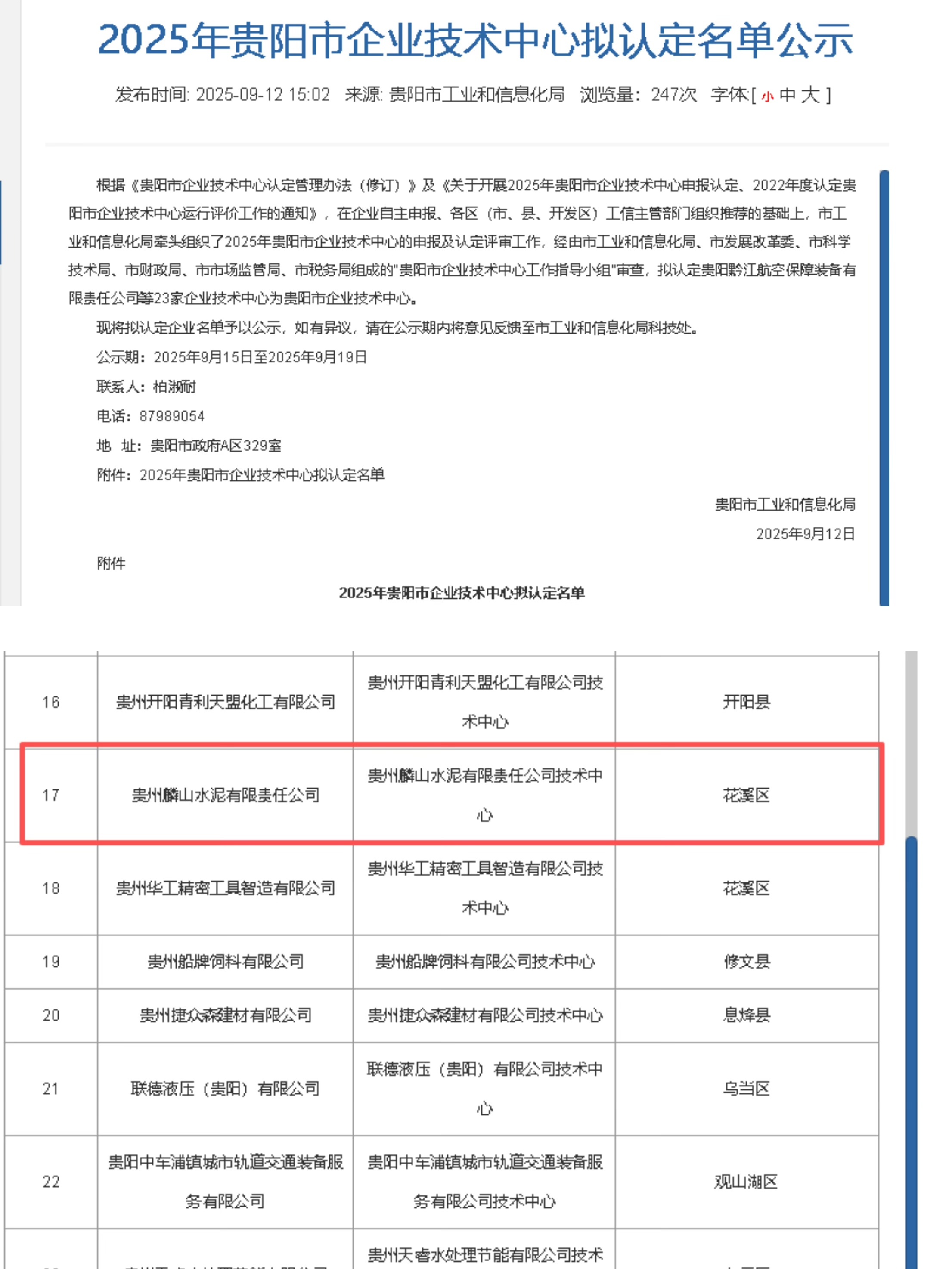 2025年9月,貴陽市工業(yè)和信息化局正式公布2025年貴陽市企業(yè)技術(shù)中心認定名單,花溪公司憑借在綠色建材領域的技術(shù)突破與產(chǎn)業(yè)示范效應,成功躋身市級企業(yè)技術(shù)中心行列。